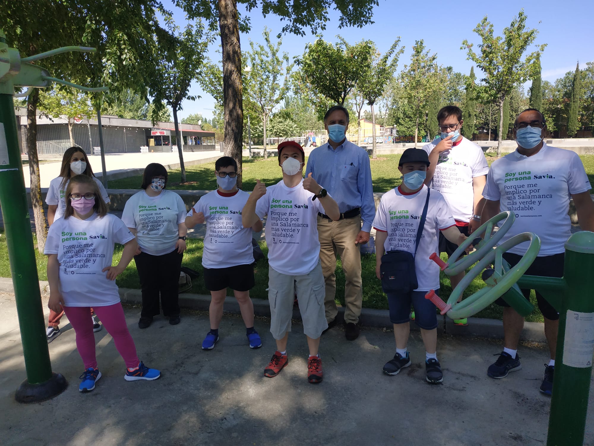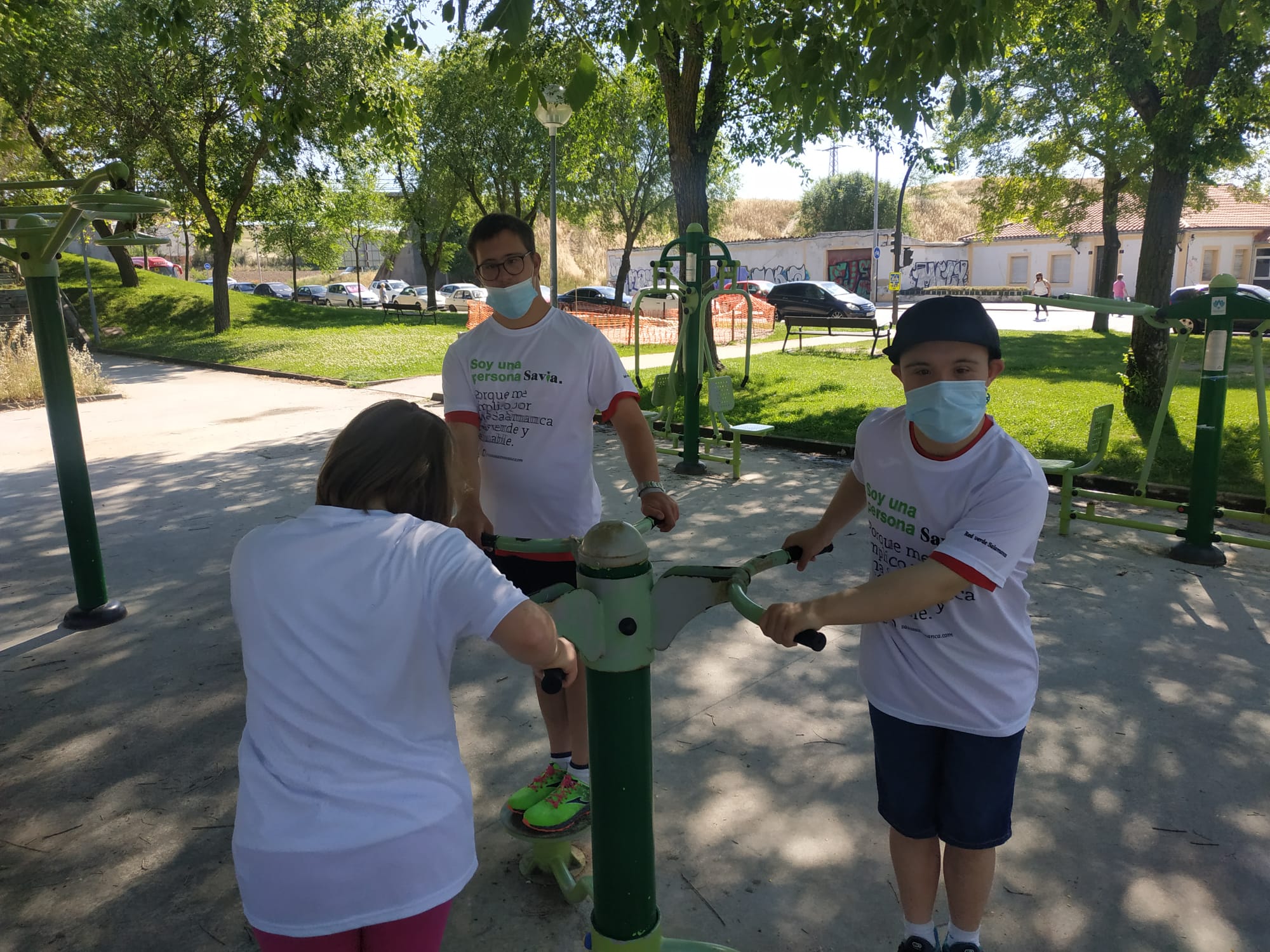 Hoy hemos podido disfrutar de la actividad de parques saludables en el Parque de Würzburg. Esta acción ha sido organizada por el Excmo. Ayuntamiento de Salamanca e incluida en la I Semana SAVIA de actividades por el día Mundial del Medio Ambiente; un ejemplo de las oportunidades que ofrece nuestra ciudad para hacer deporte al aire libre, para cuidar nuestra salud y poder mantener relaciones sociales con personas o entidades a las que también les gusta el deporte; hoy la compartimos con nuestros amigos de Síndrome de Down.