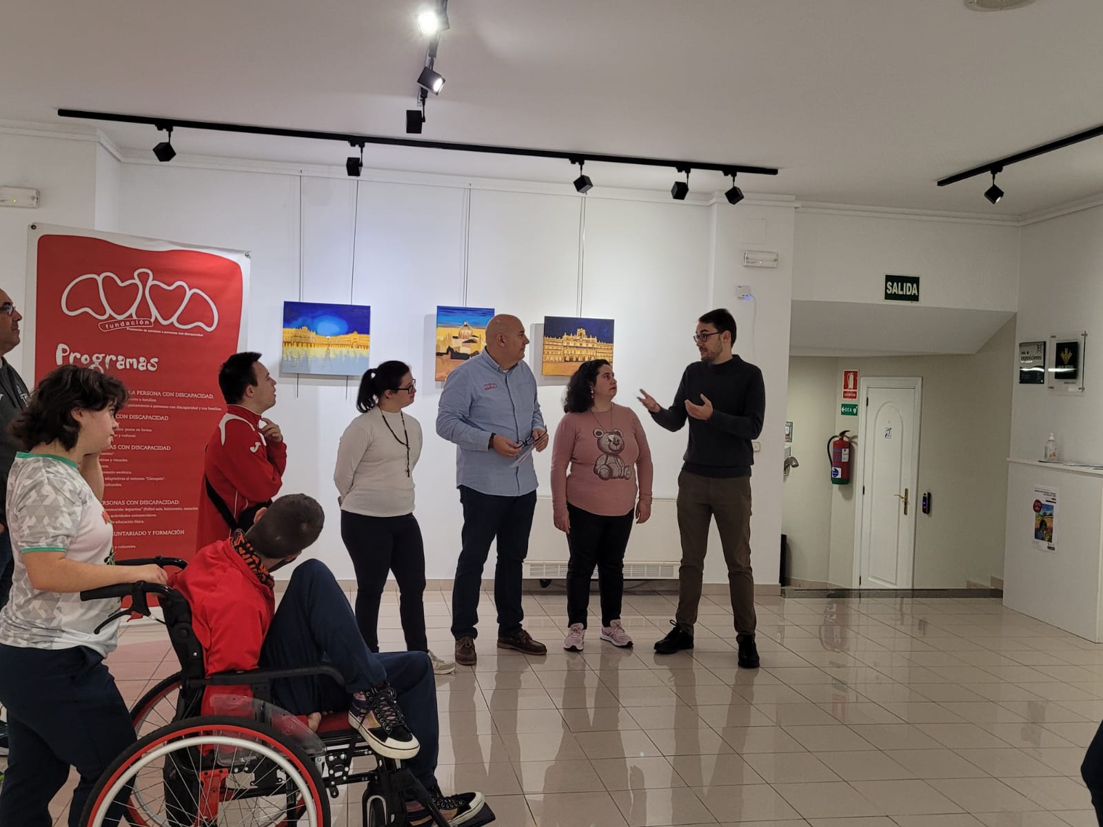 El concejal de juventud del Exmo. Ayuntamiento de Salamanca, Angel Fernández, ha sido quien ha oficiado el acto de inauguración al que también han asistido en representación de los artistas Mercedes Pinto y Ana Raquel Seguín. Acompañando a los artistas, como lo hacen cada miércoles de taller, han asistido algunos de los voluntarios, técnicos de la fundación, miembros del patronato y amigos de los artistas.