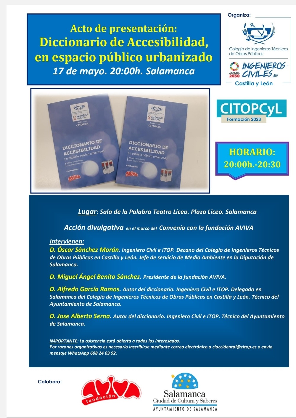 Nos alegra compartir con todos la presentación del Diccionario de accesibilidad en espacio público urbanizado” editado por el Colegio de Ingenieros Técnicos de Obras Públicas. AVIVA ha colaborado en la validación de muchas de las propuestas de mejora que se proponen. Como dicen sus autores, Alfredo García y Jose Alberto Serna, este diccionario pretende ser una herramienta de consulta, organizada alfabéticamente, que complementa la normativa de accesibilidad existente.