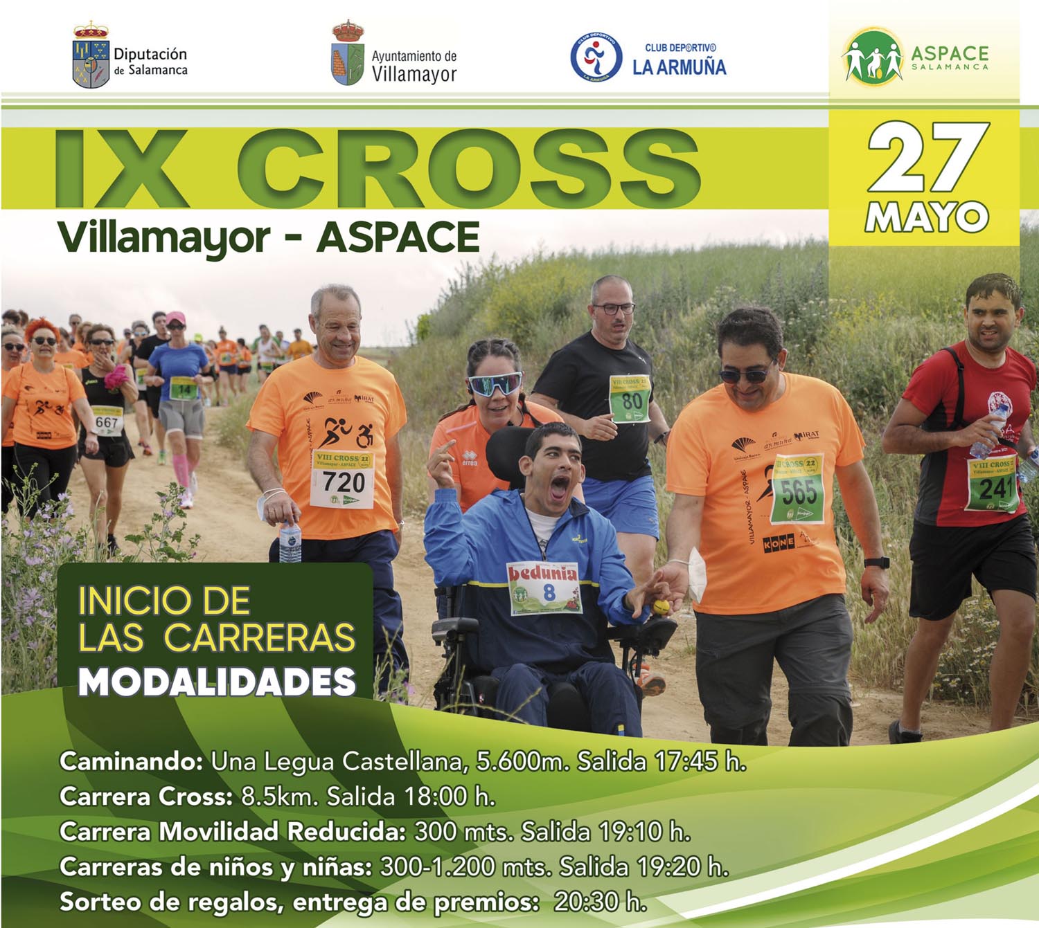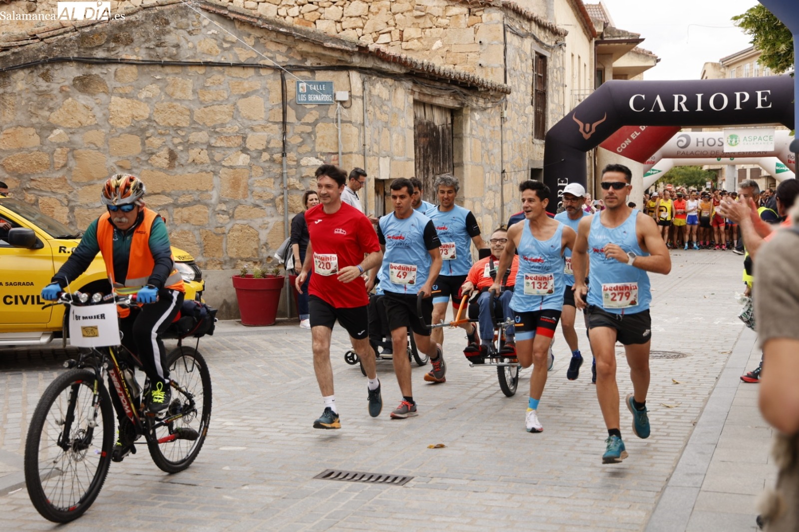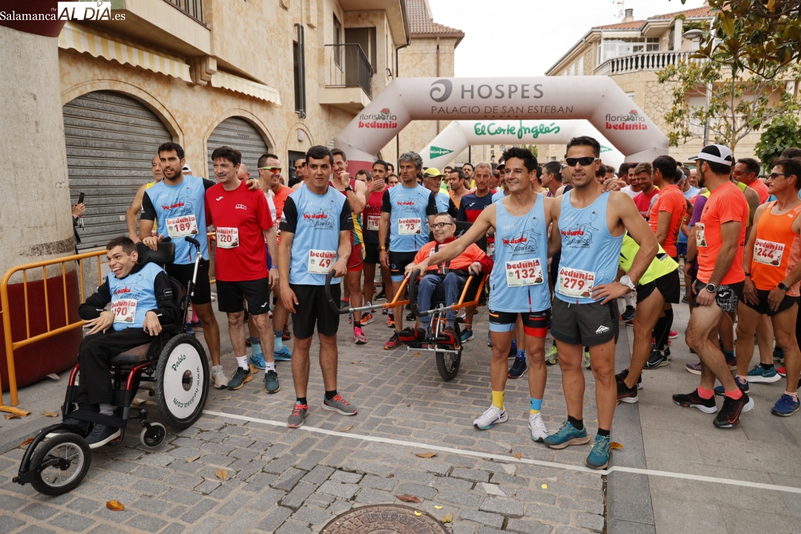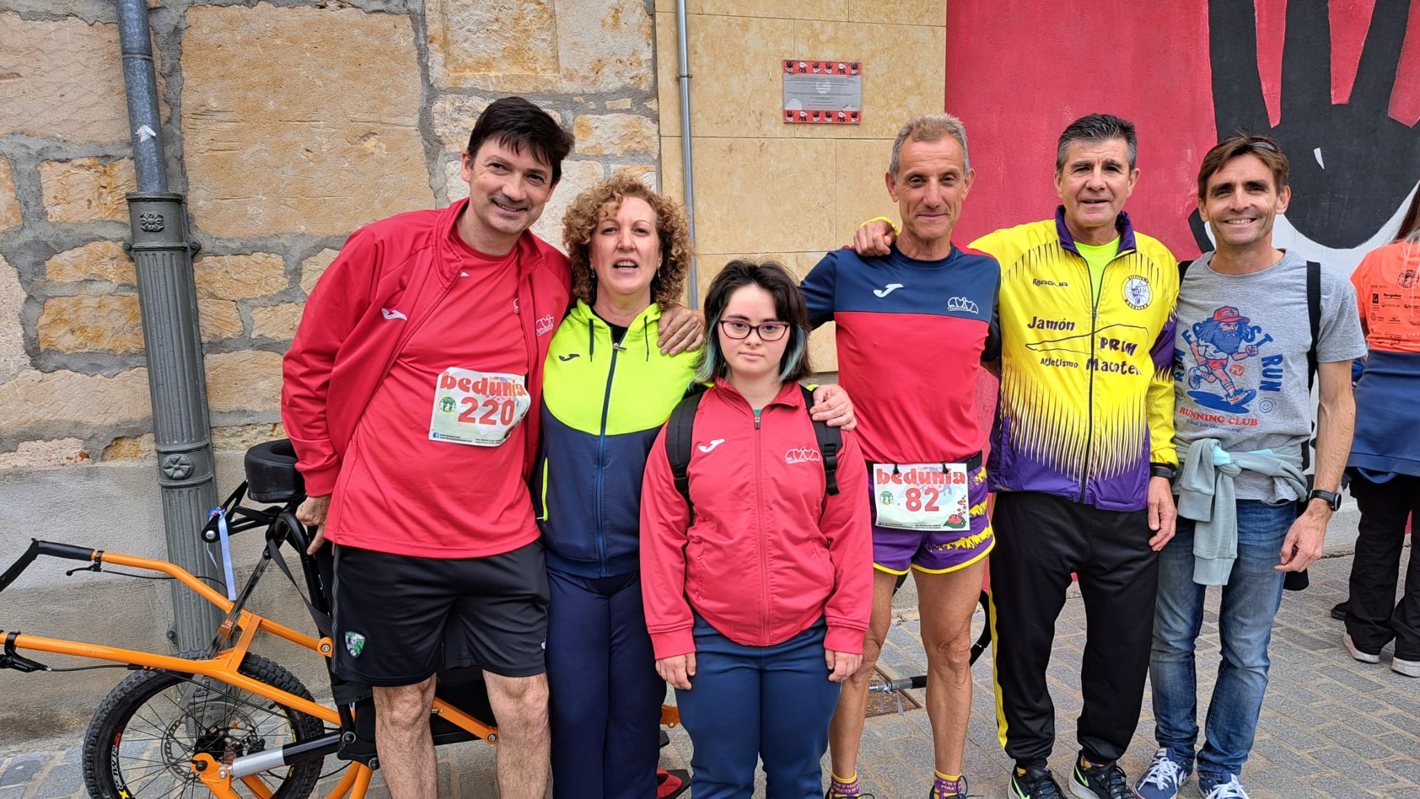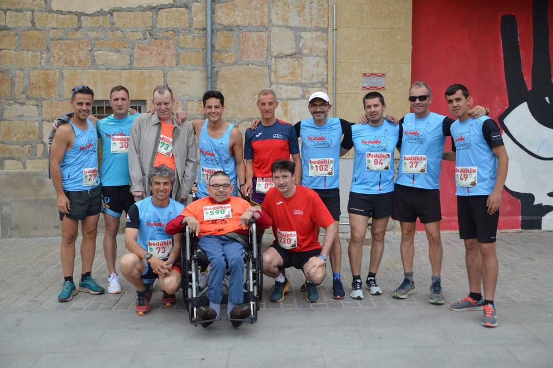 Como nos describe nuestro compañero Eugenio “fue un día muy especial por diferentes motivos. Pedro Borreguero cumplió su sueño de poder participar en la carrera de 8,5 kilómetros gracias al apoyo de Bedunia, Macotera y Aviva. Este sueño fue posible por la colaboración de COCEMFECYL que nos cedió la silla Joêllette llegada desde Palencia.”