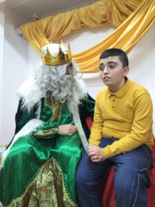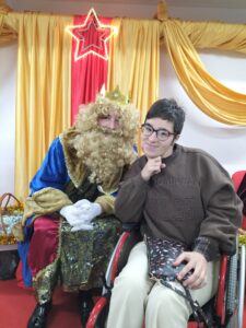 La cita se celebró en el Centro Municipal Luis Vives. Recibimos a Sus Majestades con un pasillo de reconocimiento y ellos nos recibieron a nosotros con uno bonito mensajes de Esperanza, Amor y Paz. ¡Así comenzó nuestra tarde de Reyes!, mientras unos bailábamos, otros compartíamos conversación y nos hacíamos fotos con los Pajes Reales. La fiesta contó con la música de Mariki Dj y su animación. El equipazo de voluntarios se encargó de la bebida, el reparto de roscón y de hacer que la fiesta fuera inolvidable.