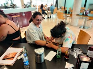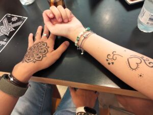 El taller de conocimiento de Egipto nos ha encantado, pero aún nos faltaba por descubrir las danzas árabes. Para ello tuvimos una clase magistral con Alba, que además de enseñarnos pasos de la danza del vientre, también nos trajo perfumes fabricados con aceites naturales, que olimos y nos encantaron. De recuerdo, quien quiso se llevó un tatuaje en su piel.