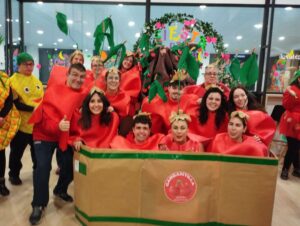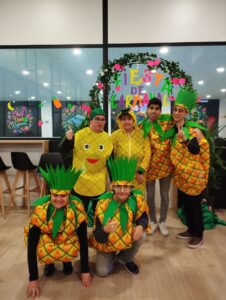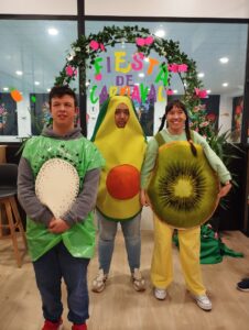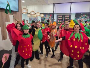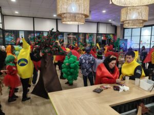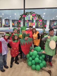 Este año, la temática elegida fue “Carnaval de la fruta”, y las instalaciones de Pickleball, en la Carretera de Valladolid 26, en el polígono de Villares de la Reina, se transformaron en un auténtico mercado lleno de sabores. Plátanos, fresas, uvas, papaya, aguacate, tomates, pera, manzanas, limon, naranjas, piñas, sandía, cerezas, cerezo e incluso un espantapájaros desfilaron por el recinto, creando una explosión de creatividad.