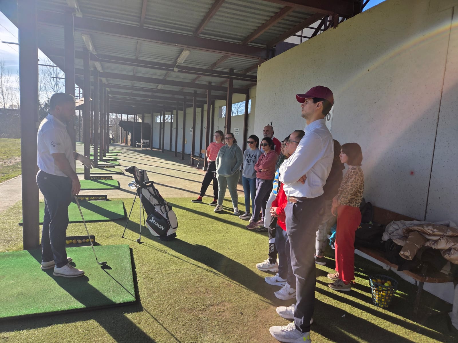 Nos dividimos en dos grupos. Con Rubén practicamos el movimiento completo que se realiza para golpear la bola. A este movimiento se le llama “Full swing”. También aprendimos la colocación de manos y piernas alineadas con la bola. Además, nos dio a conocer el número de palos máximos que se suelen llevar en la bolsa de golf, a la que ellos llaman “tour staff”.