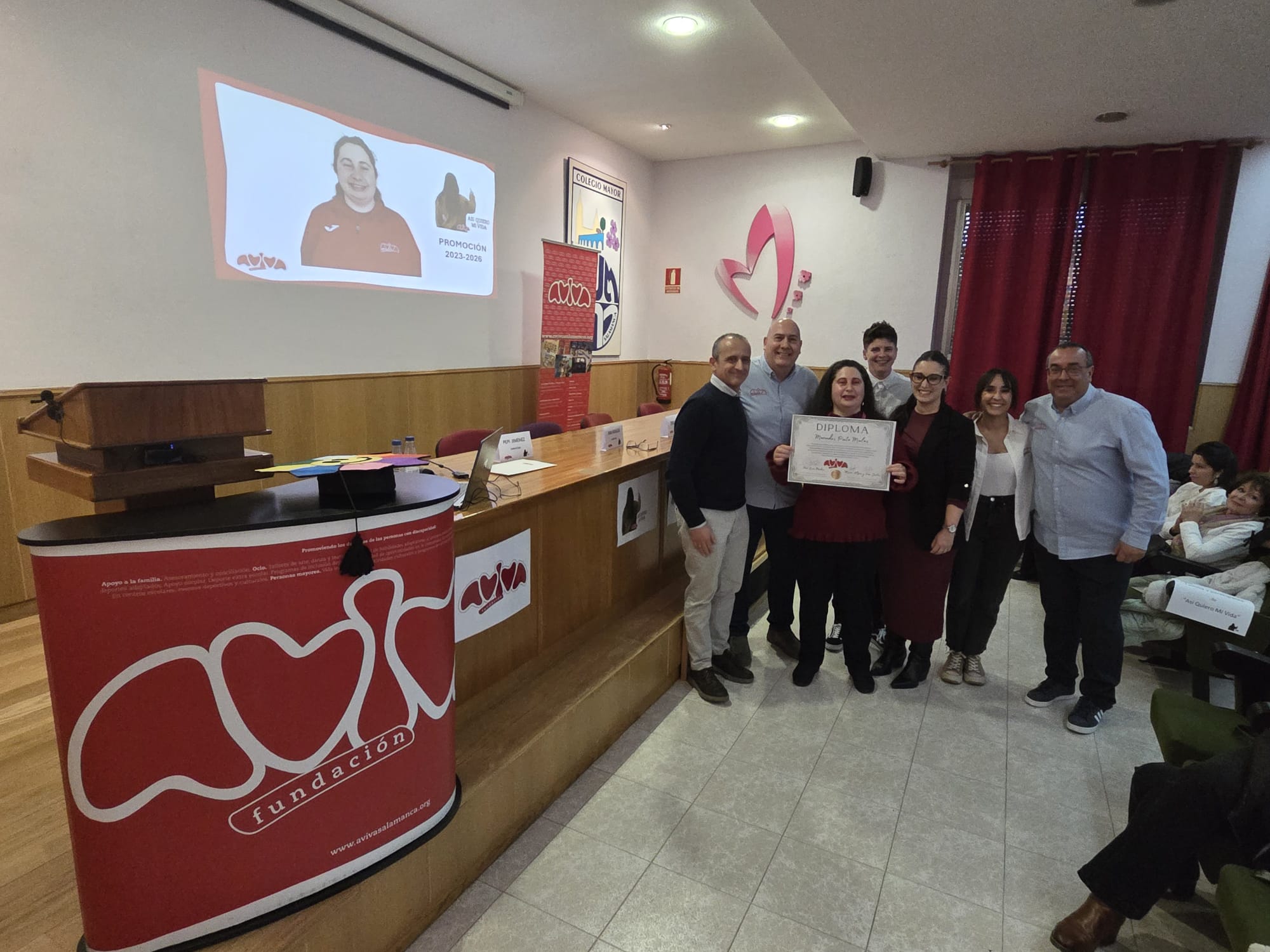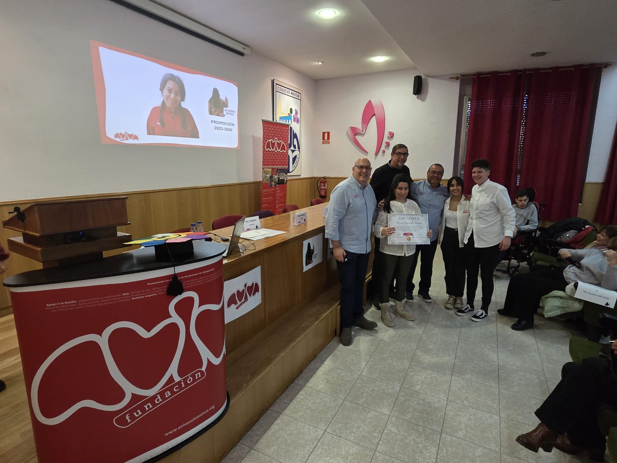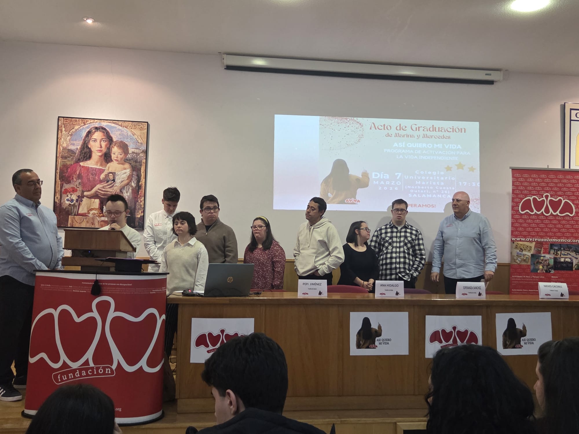 El acto se desarrollo en el Centro Universitario Marista con la asistencia de varios miembros del patronato de la fundación, profesionales, voluntarios, amigos y familiares de las dos graduadas. También nos acompañaron miembros de las entidades colaboradoras del programa, como el colegio San Estanislao de Kostka y grupo musical AVIVA2, que han apoyado y arropado a Marina y Mercedes en estos años formativos.