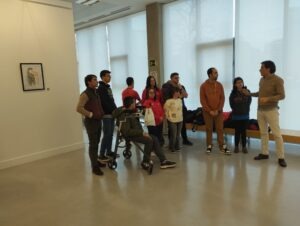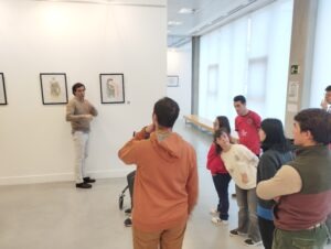 Una cosa llevó a la otra y hoy estamos visitando su primera exposición. En ella hemos podido ver un total de 20 piezas. Entre ellas hay cuatro lienzos y una serie de láminas enmarcadas bajo un mismo formato. La temática esta distribuida en series, como los detalles y momentos relacionados con el mundo taurino, la monumentalidad de la capital salmantina o la temática de lo que ocurre en el campo de Salamanca.